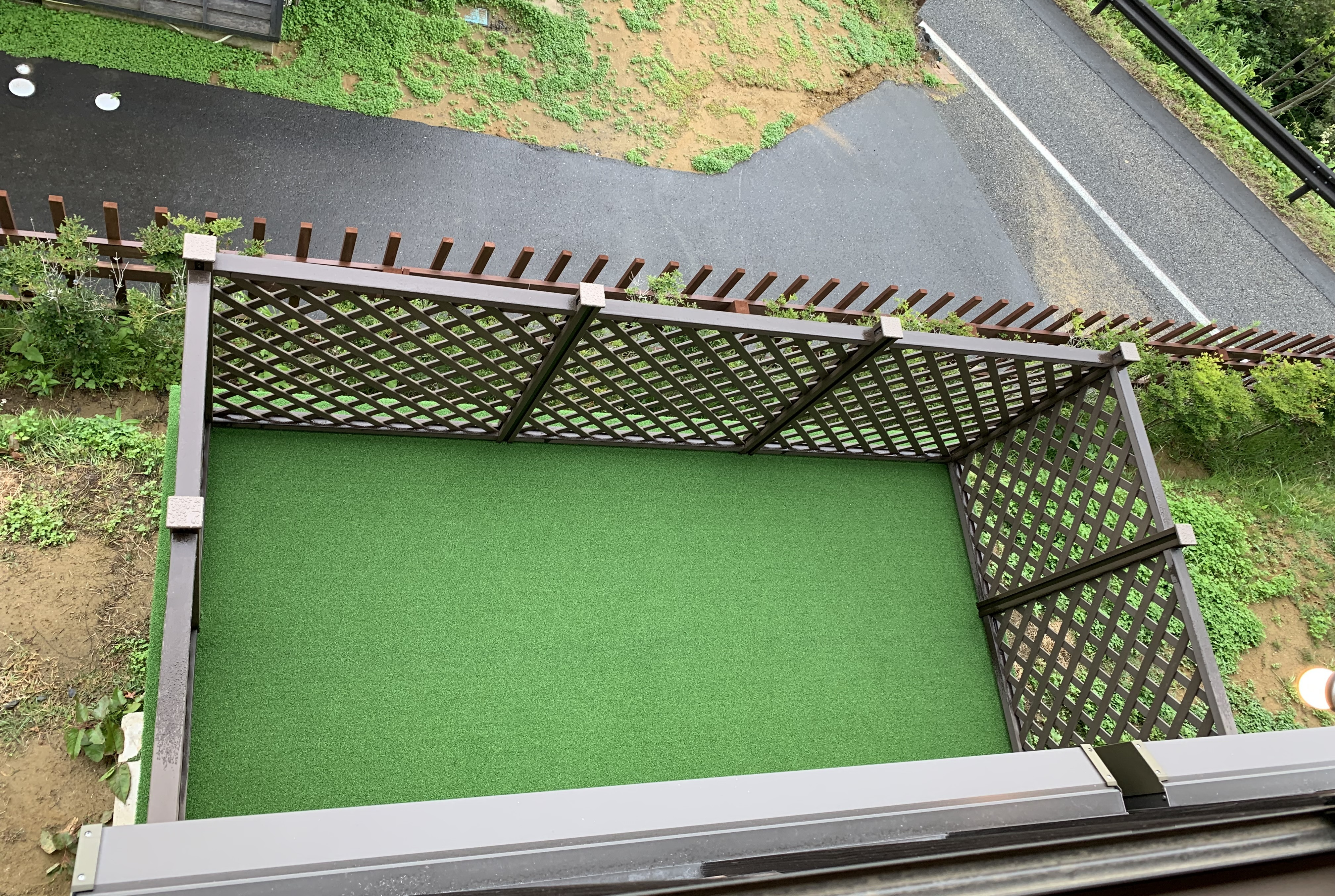 ワンちゃんと遊べるウッドデッキにはLIXILの樹ら楽ステージ、ウッドパーテーションを使い、足元には人工芝を貼り付けてあります。
